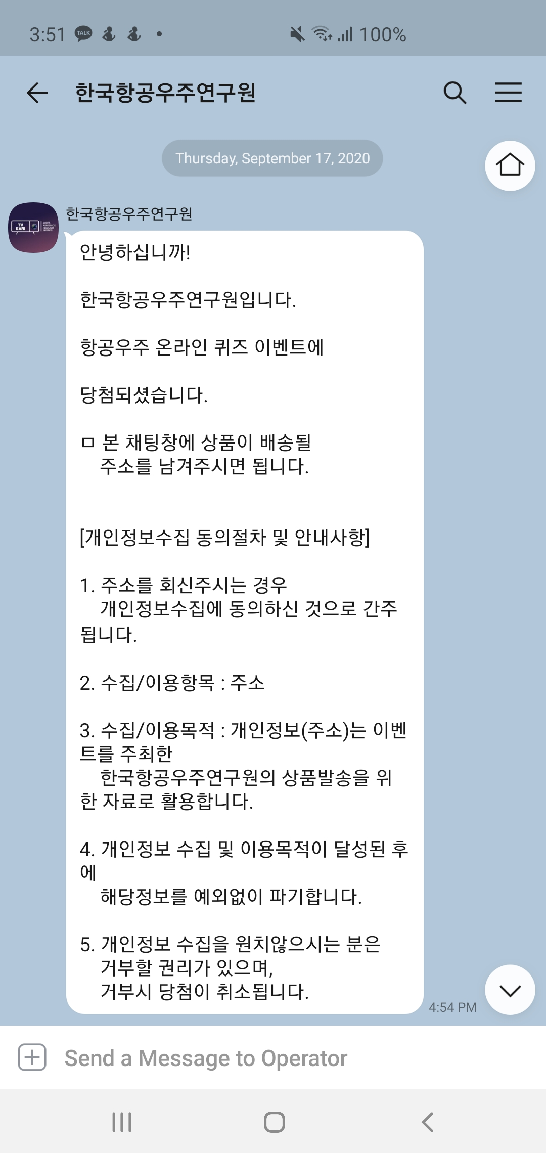 따로 발송하지 못하였습니다. 죄송합니다. 항공우주 온라인 퀴즈 이벤트가 마감되었습니다. (집계결과 참여인원 총 1,295명) 공정하고 원활한 추첨진행을 위해 현재 1:1채팅을 막아놓은 상태입��